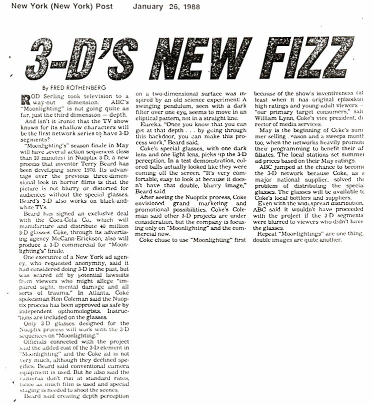 This venture wasn't a total loss for Coca-Cola and Nuoptix, however, because in January 1989, they used the cardboard glasses manufactured for the "Moonlighting" episode for a Superbowl ad which became the first national televised 3-D event. What could have been a historic televison moment for "Moonlighting," their planned 3-D episode unfortunately never saw the light of day.
