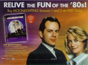 My Biased Review of the Moonlighting DVDs By Diane Hopkins, co-editor of DavidandMaddie.com I couldn't believe it... was actually holding them in my hands. The Moonlighting Dvds! So then I went for the extras. There are two "documentary like" features, the first in two parts. The first is called "Not Just a Day Job - The Story of Moonlighting, Part 1", and then of course, "Inside the Blue Moon Detective Agency - The Story of Moonlighting, Part 2". As expected, these tell the story of the development of the series and some inside and background information about the show. Comments are made by all the principal participants - Glenn Caron, Bruce Willis, Cybill Shepherd, and Allyse Beasley, plus an exceptional group of writers, directors, editors, and production people. The second features is called "The Moonlighting Phenomenon" and uses the same people to tell about what is was like to be part of the unique 80's experience.
